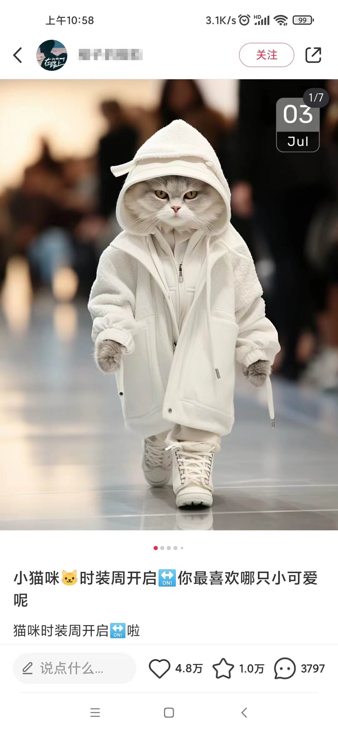 小红书最新爆款项目,Animal秀,7天变现1w+Animal秀在小红书上是非常爆款的项目,动不动就几万的赞,笔记的内容主要是猫咪走秀搭配一段文案,就是一只猫穿着人类的衣服在走T台,看起来非常的新奇特,加上小红书的主要用户群体是女性用户,女大学生,少女,宝妈这类,而大部分女性都是比较喜欢猫咪这类动物,加上我们的猫咪图片非常的可爱或者酷帅,很难不爱。我从小红书上截了一些图给大家看下: